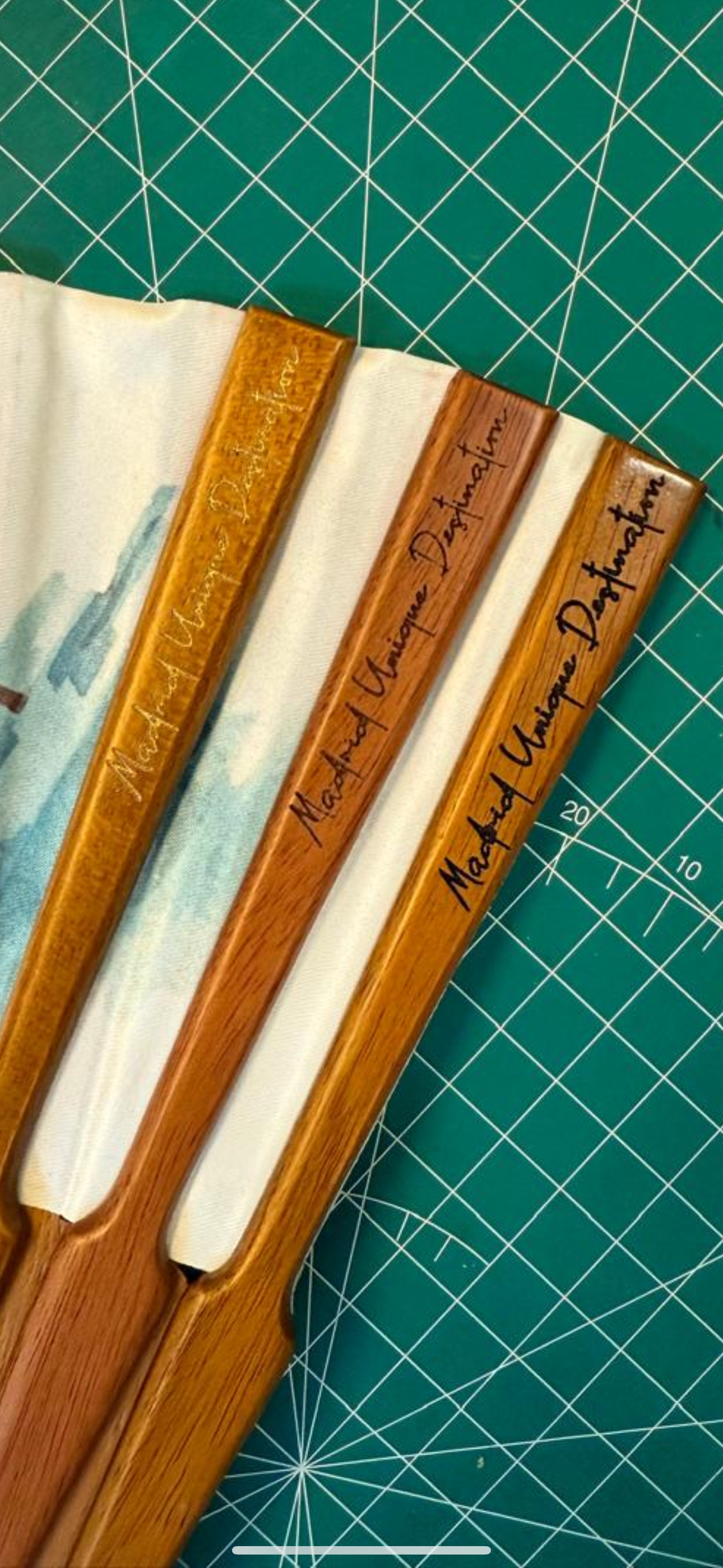 Hand fan ribs personalised with client logos or themes, with expert guidance on selecting the perfect colors and details to create a truly exceptional and customised luxury fan.
